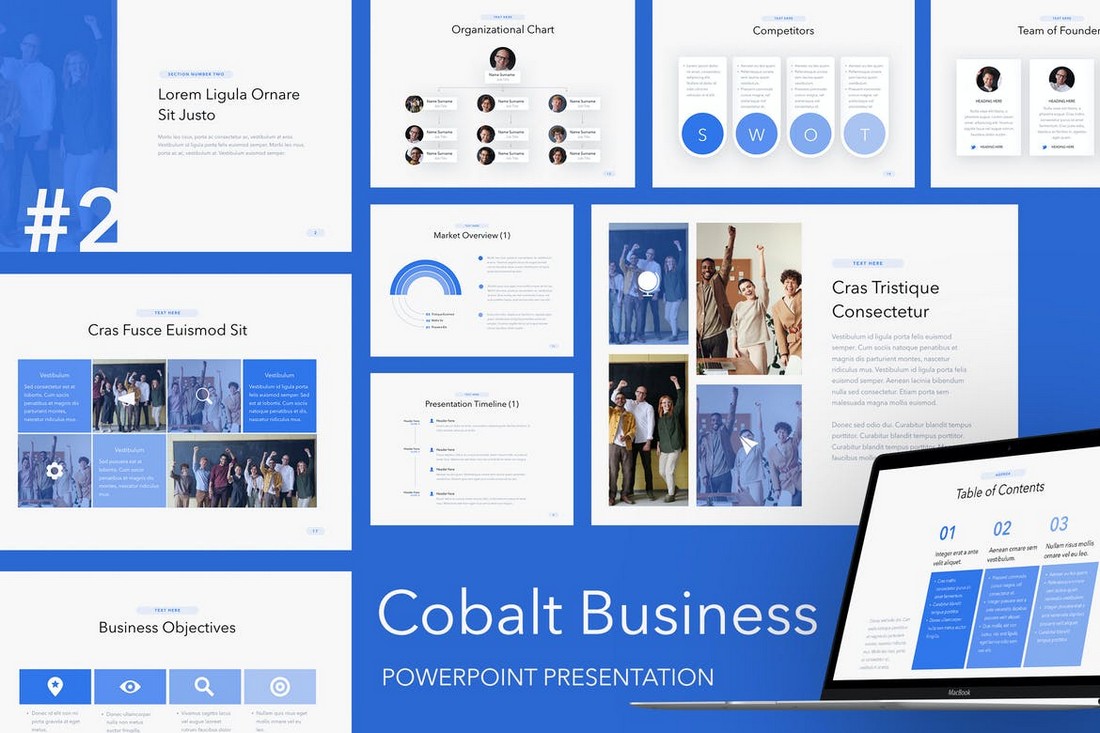 Cobalt is a PowerPoint template made for creating various business-related presentations. It includes 20 unique slide designs for crafting business agendas, meeting agendas, and more. The slides are fully customizable so feel free to make them your own. They are ideal for making business profile presentations as well.