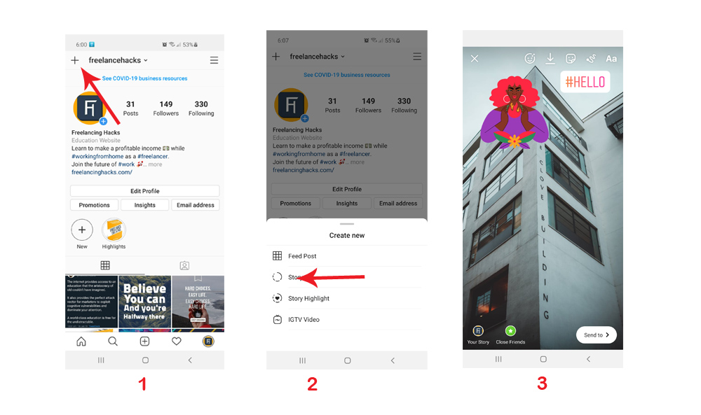 - To create an Instagram Story, tap on the plus icon on the top-left.