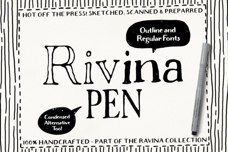 A fun and creative option, the Playbook font family includes a playful outline font that mimics the style of a tall sans serif typeface hand drawn in fine black ink. It’s best used as a title or heading, and is especially fitting for use with artistic endeavors such as theatre productions or book covers.